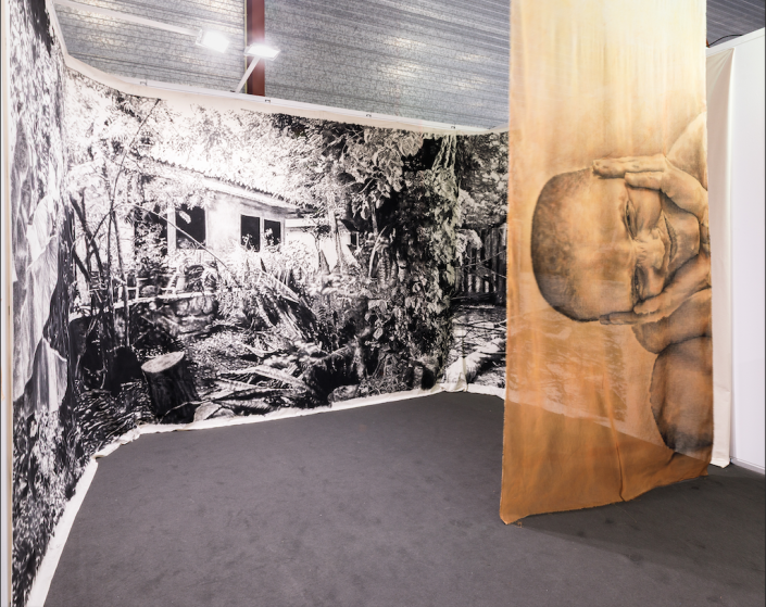 In echo of home ontvouwt Lise Lou Sore een totaalinstallatie van monumentaal formaat waarin zelfportretten op transparant katoen samensmelten met de echo van het landschap waarin Sore opgroeide. Geboren in Niger, als kind van expat-ouders, groeide Lise Lou Sore op in de warmte van een hechte gemeenschap voordat het gezin abrupt naar Nederland verhuisde. Deze ontworteling en voortdurende aanpassing vormen een terugkerend thema in het werk. Transparante zelfportretten zweven in de ruimte, bewegen mee met hun omgeving en bieden een meeslepende ontmoeting met kwetsbaarheid. Echo of home is een uitnodiging om door het innerlijke landschap te dwalen en herinneringen opnieuw te lezen.